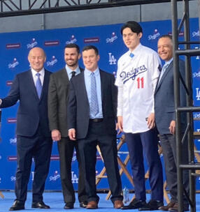 ⇦ ドジャース入団会見で笑顔を見せる佐々木朗希(右から2番目)。左からカステン球団社長、ゴームズGM、フリードマン編成本部長、佐々木、ロバーツ監督